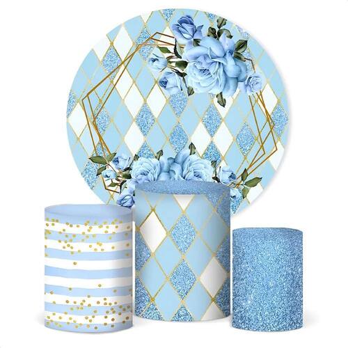 Painel De Festa E Capa Cilindro Decora Flores Geométrico Azu