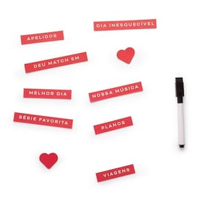 Painel De Fotos E Lembretes Nosso Amor Para lembrar do seu amor para sempre, que tal um painel de fotos e lembretes lindo e super customizável para deixar aquele cantinho único, igual a você? Repleto de palavras para complementar as memórias especiais que fazem parte da sua história com a pessoa amada, esse produto trará mais romance para o seu dia a dia, além de sempre poder receber novas lembranças, bilhetes e muito amor! Contém 1 painel, 1 caneta com apagador, 2 ímãs e 8 marcadores imantados Material: plástico e componentes magnéticos