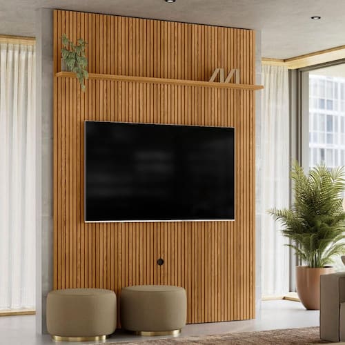 Painel em MDF frisado (baixo relevo), estrutura com chapas em MDP e MDF de 12 e 25mm. Produto desenvolvido para ser fixado na parede. O televisor deve ser fixado no painel.