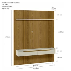- Formato do móvel: Painel - Polegadas: Acima de 47" - Garantia: 3 Meses - Volumes: 3 - Tamanho Máximo da Tv: Até 65 Polegadas - Recomendações de manutenção: Recomendado uso de pano umedecido. Não aplicar lustra móveis. - Tipo de Porta: Basculante - Quantidade de Portas: 2 - Produto Necessita de Montagem?: Sim - Peso do Produto Montado: 685 - Material da Estrutura: Mdp e Mdf - Escala de Brilho: Acetinado - Acabamento: Pintura UV - Peso Máximo Suportado: 32 - Medida do Produto Montado (LXCXA): 33cmX179,2cmX218cm