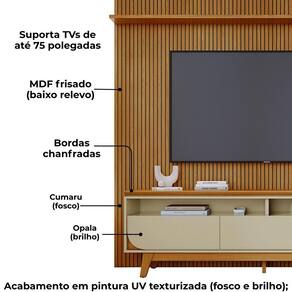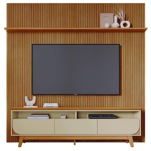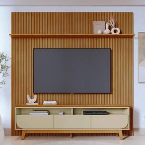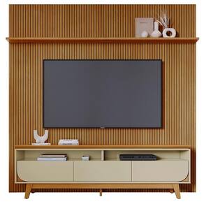 Painel e Bancada Luna, modernidade e estilo atual em um só conjunto. Estrutura em MDP/MDF com acabamento em pintura UV texturizada. Composto por frisado do chão ao teto (baixo relevo em MDF), dois nichos, três gavetas (sendo 2 com cantos curvos), corrediças telescópicas e 1 prateleira superior. Destaque para o tampo usinado, estilo suspenso com borda chanfrada. Este produto será entregue em 5 volumes.