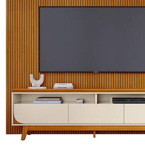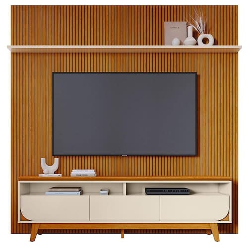 Painel e Bancada Luna, modernidade e estilo atual em um só conjunto. Estrutura em MDP/MDF com acabamento em pintura UV texturizada. Composto por frisado do chão ao teto (baixo relevo em MDF), dois nichos, três gavetas (sendo 2 com cantos curvos), corrediças telescópicas e 1 prateleira superior. Destaque para o tampo usinado, estilo suspenso com borda chanfrada. Este produto será entregue em 5 volumes.
