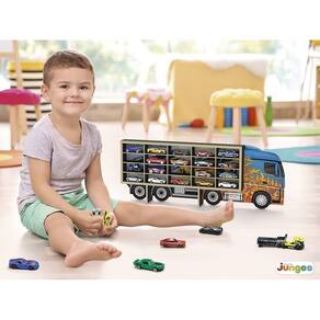 - EXPOSITOR CAMINHÃO PORTA HOTWHEELS 20 CARRINHO - Especial para carrinhos Hot Wheels (em escala 1:64)Produto fabricado no Brasil com Inmetro e de SUPER Qualidade. Os meninos vão brincar e guardar sua coleção de carrinho com estilo !!!*CARACTERISTICAS*- Capacidade para 20 carrinhos em escala 1:64 (HotWheels)- Formato de caminhão- Nichos de 9,2x3,5cm cada- Produto montado e decorado- Opção de pendurar na parede (acompanha bucha) ou Manter em pé sobre prateleiras e mesas (acompanha suportes)* Não acompanha carrinhos (imagens meramente ilustrativas)FABRICADO EM madeira de MDF com pintura atóxica e detalhes em serigrafia.Dimensões do produto: 64x05x25 cm