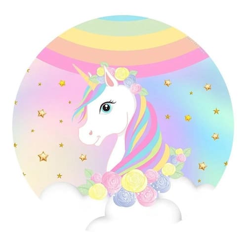 Painel Festa Redondo Sublimado 3D Tecido C Unicórnio Arco-Ír