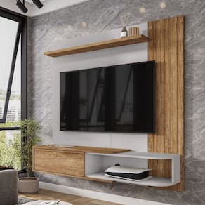 Características: Estruturado em MDP e MDF 1 Porta Basculante Porta com dobradiças metálicas Acabamento pintura com verniz Poliéster UV Prateleira Superior em MDP de 25mm Painel Frisado em MDF de 15mm Suporta TV até 55 Polegadas Prateleira suporta de 8 á 10kg