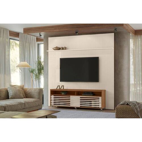 "A Composição Frizz New Prestige eleva a sofisticação e funcionalidade da sua sala, com um design moderno e prático, sendo fabricada com uma estrutura que combina MDP e MDF, com chapas de 12, 15, 25 e 40mm, garantindo resistência e durabilidade, revestida com pintura UV de alta qualidade, que proporciona um acabamento elegante, suas dimensões são de 1,820 x 0,630 x 0,390m para o rack e 2,380 x 2,445 x 0,185m para o painel, apresentando um painel em MDF frisado com design em baixo relevo, portas deslizantes frisadas que se sobrepõem suavemente, conferindo modernidade ao ambiente, e uma prateleira para organização adicional, os puxadores cromados, fabricados em poliestireno, trazem elegância e resistência, enquanto os seis rodízios de silicone facilitam a movimentação sem danificar o piso, o produto é compatível com TVs de até 75 polegadas, com entrada para TV no rack de 1,820 x 0,385m e no painel de 2,380 x 1,310m, além disso, conta com o sistema de montagem Girofix, que assegura praticidade e segurança na instalação, transformando sua sala em um ambiente acolhedor e sofisticado.