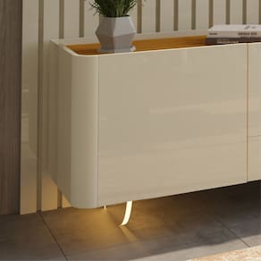 Estrutura: MDFAcabamento: Pintura U.V. não atóxico Porta: Sim, com dobradiças “SLOW MOTION” Gaveta: Sim, com corrediças telescópicas Prateleira: Sim, com bordas chanfradas e laqueadasNicho: Sim, no rack nicho curvoLED: Sim, em cor quente com difusor Pés: Sim, em vidro com LEDDiferencial: Veios decorativos de 42 mm; Rack com cantos e nicho curvosDimensões do produto montado