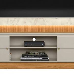 Seu design conta com 2 portas de correr com frisos decorativos, 2 prateleiras funcionais para objetos e eletronicos, alem de tampo chanfrado que adiciona requinte ao ambiente. com TVs de ate 75 polegadas, e perfeito para compor espacos modernos com estilo e organizacao.