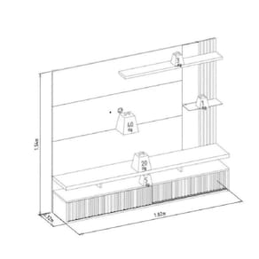 Dimensao ele tem 1,81 de largura por 1,54 de altura e comporta televisores de ate 60 polegadas e o detalhe das portas ripadas o que ha de mais presente na arquitetura hoje. E ainda as portas de correr, para que voce possa deixar tudo bem organizado e guardadinho, fantastico nao e mesmo?
