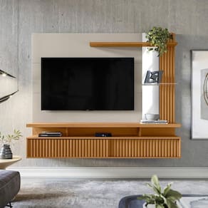 O amplo espaço para TV de até 60 polegadas do Painel Home Maragogi transforma sua sala em um verdadeiro cinema para família e amigos! Além disso, ele possui nichos organizadores, ideais para colocar aparelhos eletrônicos. Com muito charme você pode exibir na prateleira superior e prateleira de vidro suas decorações preferidas. Além de tudo, o painel home Maragogi dispõe de duas portas deslizantes com detalhe em ripado para que você possa guardar com estilo aqueles objetos úteis do dia-a-dia, mas que não precisam aparecer.