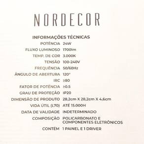 Painel Led Sobrepor Recuado 24W Preto 3000K Preto Nordecor O Painel Led Sobrepor Recuado 24W Preto 3000K Preto Nordecor é a escolha perfeita para quem busca uma iluminação eficiente e moderna. Com design elegante e discreto, esse painel de sobrepor é ideal para ambientes internos, proporcionando uma iluminação uniforme e agradável. Fabricado em policarbonato resistente, esse painel possui acabamento em preto fosco, o que confere um toque de sofisticação ao ambiente. Com medidas de 28cm x 28cm x 4,6cm, esse painel é compacto e fácil de instalar. A temperatura de cor desse painel é de 3000K, o que proporciona uma luz quente amarelada, perfeita para criar um ambiente aconchegante. Com potência de 24W, esse painel oferece uma iluminação intensa, sem consumir muita energia. Esse painel possui ângulo de abertura de 120 graus, o que garante uma iluminação ampla e abrangente. Além disso, ele não é dimerizável, ou seja, não é possível ajustar a intensidade da luz. Com nível de proteção IP20, esse painel é indicado para uso interno, sendo ideal para salas, quartos, cozinhas, escritórios e outros ambientes residenciais e comerciais. Ele é bivolt, ou seja, pode ser utilizado em redes elétricas de 110V ou 220V. 1. Esse painel possui ? Não temos informações sobre a deste produto. 2. Posso utilizar esse painel em ambientes úmidos? Não, esse painel possui nível de proteção IP20, o que significa que ele é indicado apenas para uso interno e não é resistente à umidade.