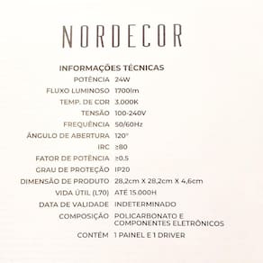 Painel Led Sobrepor Recuado 24W Preto 3000K Preto Nordecor O Painel Led Sobrepor Recuado 24W Preto 3000K Preto Nordecor é a escolha perfeita para quem busca uma iluminação eficiente e moderna. Com design elegante e discreto, esse painel de sobrepor é ideal para ambientes internos, proporcionando uma iluminação uniforme e agradável. Fabricado em policarbonato resistente, esse painel possui acabamento em preto fosco, o que confere um toque de sofisticação ao ambiente. Com medidas de 28cm x 28cm x 4,6cm, esse painel é compacto e fácil de instalar. A temperatura de cor desse painel é de 3000K, o que proporciona uma luz quente amarelada, perfeita para criar um ambiente aconchegante. Com potência de 24W, esse painel oferece uma iluminação intensa, sem consumir muita energia. Esse painel possui ângulo de abertura de 120 graus, o que garante uma iluminação ampla e abrangente. Além disso, ele não é dimerizável, ou seja, não é possível ajustar a intensidade da luz. Com nível de proteção IP20, esse painel é indicado para uso interno, sendo ideal para salas, quartos, cozinhas, escritórios e outros ambientes residenciais e comerciais. Ele é bivolt, ou seja, pode ser utilizado em redes elétricas de 110V ou 220V. 1. Esse painel possui ? Não temos informações sobre a deste produto. 2. Posso utilizar esse painel em ambientes úmidos? Não, esse painel possui nível de proteção IP20, o que significa que ele é indicado apenas para uso interno e não é resistente à umidade.
