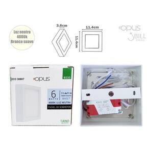 Painel led com redução no consumo de energia pode ser instalado em forros de gesso, madeira, lajes, alvenaria entre outros. Perfeito para iluminação uniformeProduto desenvolvido com tecnologia led de última geração e rigoroso controle de qualidade; testado de fábrica e reavaliado antes do envio - modelo painel led quadrado de sobrepor - marca opus - potência: 6w- tensão: 100-240v bivolt - temperatura de cor: branco frio 6500k- driver incluso - fluxo luminoso: 360lm- ângulo de abertura: 120- frequência: 60hz- corrente: 0.06a- fator de potência: 0,5- irc: 70- índice de proteção: ip20- não permite dimerização - temp. De operação: -10c a 40c- dimensões: 11cm x 11cm x 2.8cm - peso: 185g- composição: alumínio e polímero sintético - código: 31439