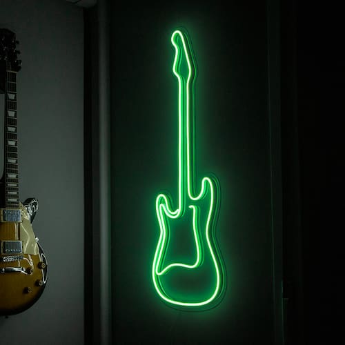 - Modelo: GUITARRA - Tamanho: 32x95cm - Base: Acrilico com fita DUPLA FACE - LED: Fita LED NEON silicone de 19w/metro - Tensão: 12V - Fonte: Acompanha fonte BIVOLT - Grau de proteção: IP20 - USO INTERNO - NÃO É A PROVA D´AGUA - Anuncio de 1 luminoso GUITARRA