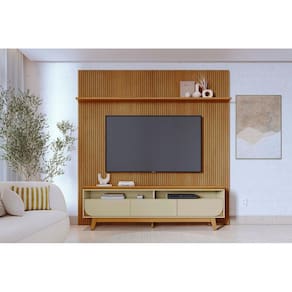 A Composição Luna combina design sofisticado e funcionalidade, sendo fabricada com uma estrutura em MDP e MDF, com chapas de 12, 15 e 25mm, que garantem resistência e durabilidade, e revestida com pintura UV de alta qualidade, que proporciona um acabamento impecável. Suas dimensões são de 2,380 x 2,445 x 0,185m para o painel e 2,000 x 0,625 x 0,360m para a bancada, oferecendo amplo espaço para acomodar TVs de até 75 polegadas. O painel apresenta um elegante frisado em MDF com design em baixo relevo, enquanto a bancada possui um tampo suspenso de 25mm com borda chanfrada, conferindo modernidade ao ambiente. Conta com três gavetas com corrediças telescópicas, sendo duas laterais com detalhes curvos que adicionam sofisticação e uma prateleira para organização adicional, além de pés usinados que garantem estabilidade e estilo. O espaço para TV é de 2,380 x 1,200mm no painel e 2,000 x 0,360m na bancada, suportando um peso total de até 45kg. O sistema de montagem Girofix facilita a instalação, tornando a Composição Luna a escolha ideal para transformar sua sala em um ambiente moderno e acolhedor.