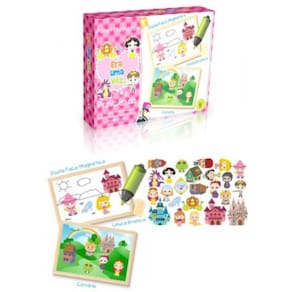 Brinquedo educativo que de um lado contém uma lousa branca magnética, e do outro lado um cenário magnético, onde a criança irá usar a imaginação e a criatividade, utilizando os personagens para criar lindas histórias de faz de conta.