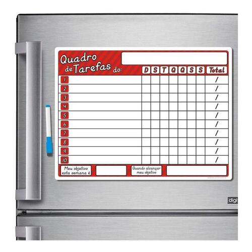 Painel Magnético Quadro De Tarefas Super Nanny Vermelho Os Nossos Imãs para geladeira são impressos com tinta Eco-Solventes com qualidade fotográfica em Vinil Autocolante e depois fixado em uma Manta Magnética com 0,8 mm espessura, ideias para serem fixados em geladeiras. São ideais para quem quer fazer mudanças no ambiente da cozinha de sua casa sem gastar muito, além do seu preço acessível dispensa a contratação de profissionais, já que você mesmo(a) pode fazer a instalação. Painel Magnético Quadro de Tarefas ou incentivo. Medida do painel: 40cm x 30cm. O painel magnético colorido é perfeito para recompensar o bom comportamento das crianças em casa, creches ou escolas. Como utilizar: 1- Relacione as tarefas; 2- Marque se as mesmas foram concluídas ou não; 3- Defina o nº de pontos e a recompensa por semana. Acompanha uma caneta azul com imã e apagador + Recarga Azul Recomendações: Faça a limpeza periódica do seu quadro de tarefas com removedor.
