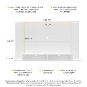 O Painel para TV até 60 polegadas Quebec Multimóveis é uma solução prática e elegante para deixar sua sala de estar mais bonita e confortável para assistir seus programas e séries favoritos. Produzido em MDP com acabamento acetinado (cerca de 20% de brilho), que tornam o móvel mais durável e resistente, o painel possui passagem para os fios que deixam os cabos organizados e o visual mais clean. Além de suportar TV de até 60 polegadas, possui 2 nichos para acomodar os principais equipamentos eletrônicos e, o melhor: é super fácil de montar.