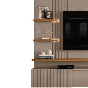 Diferenciais: Detalhe ripado. Fita de LED nas prateleiras. Design moderno. Sistema de Montagem: Parafuso/ Miniflix / Cavilhas. Manual de Montagem: Sim. Complexidade da Montagem: Media. Conteudo da Embalagem: 1 Painel. Volumes: 2 Volumes. Montagem: Recomendamos que seja feita por um profissional. Recomendacao de limpeza: Utilize pano levemente umido.