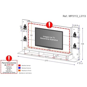 Dimensões do produto montado: Altura: 108 cm - Largura: 215 cm - Profundidade: 31,5 cm Tamanho Painel TV: 90 cm x 165 cm *Devido as variações de tamanho dos televisores no mercado, sugerimos que verifique as medidas da sua TV e compare com o painel antes de efetuar a compra. *Você pode consultar as medidas internas na imagem técnica do produto.