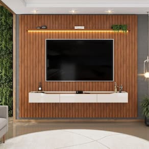 DIFERENCIAIS: Design moderno e sofisticado / Painel com ripado autêntico / Prateleira superior extensa com Led / Suportam TV de até 90 polegadas / Pintura UV de alta qualidade, 8 camadas / Espaço para aparelhos eletrônicos / 3 gavetas com frente usinada / Corrediças telescópicas / Nicho suspensa espaçosa.