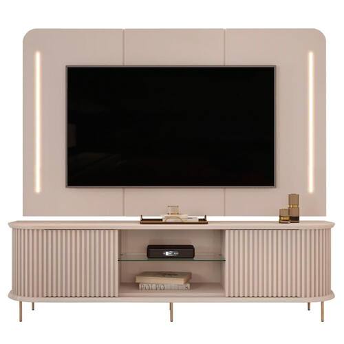 As laterais curvas ripadas do Rack para , com o tampo e a base com cantos curvos criam uma harmonia visual incrível. E as bordas chanfradas? Elas adicionam aquele toque de classe ao móvel. Com duas portas deslizantes e ripadas, você terá espaço de sobra para organizar tudo o que precisa, e as portas ripadas dispensam o uso de puxador deixando ainda mais elegante. Ele tem espaço para aparelhos eletrônicos no tampo, junto com a prateleira de vidro, e conta também com passa-fios inteligentes para manter tudo em ordem. Os pés metálicos cilíndricos na cor dourada adicionam um brilho especial, e facilitam a limpeza e aumentam a durabilidade da bancada. O Painel Suspenso com cantos arredondados e divisões com bordas chanfradas, cria um cenário perfeito para TVs de até 75 polegadas. E os perfis de LED traz sofisticação e modernidade ao conjunto. E o melhor de tudo? Tanto a Bancada quanto o Painel são produzidos 100% em MDF, garantindo que sua escolha seja de qualidade. A sala dos sonhos precisa desse conjunto.