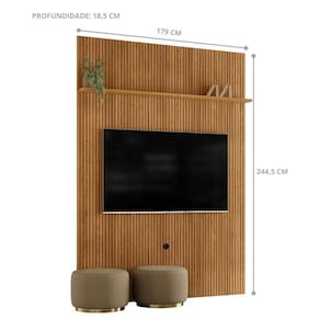 Painel em MDF frisado (baixo relevo), estrutura com chapas em MDP e MDF de 12 e 25mm. Produto desenvolvido para ser fixado na parede. O televisor deve ser fixado no painel.