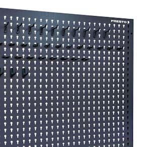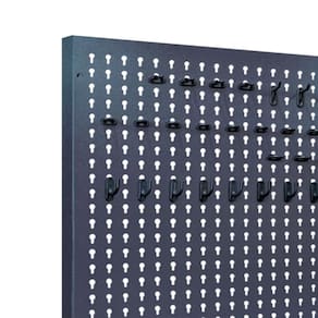 Painel Para Ferramentas Com Ganchos Plásticos 970 x 940 para ferramentas totalmente confeccionado em chapa de aço de baixo teor de carbono com espessura de 0,60mm com sistema de dobra simples na parte superior e inferior e dobras duplas nas laterais. Possui 04 (quatro) furações para instalação nas dobras laterais em formato oblongo para encaixe do painel aos parafusos previamente instalados na parede. Acabamento superficial através de tratamento químico antiferruginoso e fosfatizante com pintura eletrostática a pó.