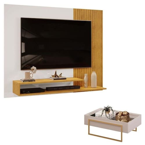 Está procurando móveis para montar sua sala? Apresentamos para você este belo conjunto composto pelo Painel para Suspenso e a Mesa de Centro da linha Petri, fabricados pela DJ Móveis. O painel possui um design moderno e detalhes frisados que valorizam o ambiente, com duas prateleiras e um nicho, é perfeita para acomodar seus aparelhos eletrônicos e objetos decorativos. A mesa de centro possui espelho aplicado sobre o tampo, bordas chanfradas e os pés em metal na cor dourado. Combinando praticidade, design e sofisticação, é perfeito para quem está buscando qualidade e sustentabilidade para elevar o estilo do seu ambiente. Confira e aproveite!