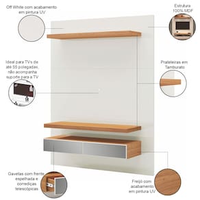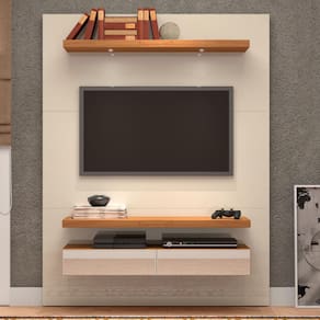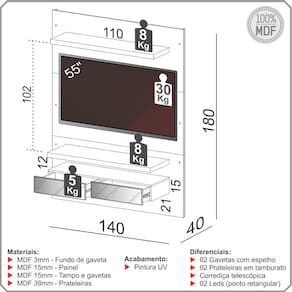 Uma das suas grandes vantagens é a prateleira superior, que não só serve como suporte para livros e objetos decorativos, como também oferece um espaço inteligente para iluminação, conferindo um toque acolhedor ao ambiente. A parte inferior, com gavetas espelhadas, proporciona a organização perfeita para eletrônicos e acessórios, mantendo tudo à mão e, ao mesmo tempo, em ordem. Para completar, esse painel suspenso é resistente e ideal para suportar TVs de até 55 polegadas, tornando-se uma peça versátil para quem busca modernidade sem abrir mão da praticidade.