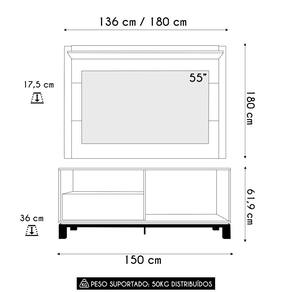 O Painel Lucca complementa o ambiente podendo ser montado em tamanhos variáveis de 136cm à 180cm, ideal para TVs de até 55 polegadas. A prateleira de 25mm oferece um espaço perfeito para personalizar a decoração com objetos pessoais, podendo ser montada na parte superior ou inferior do painel.