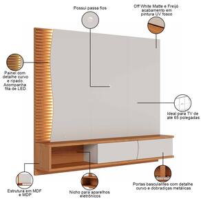 Seu design inovador apresenta um painel ondulado e ripado que traz dinamismo ao ambiente, enquanto as luzes de LED proporcionam um efeito visual acolhedor e sofisticado. Com uma estrutura robusta, o tampo e a base de 25mm garantem a resistência necessária para suportar seu entretenimento, enquanto as portas basculantes com detalhe curvado oferecem um toque de elegância e contribuem para manter o espaço organizado. Em outras palavras, esse painel suspenso foi desenhado para TVs de até 65 polegadas com instalação no painel, ou seja, é a solução perfeita para quem busca unir beleza e praticidade de forma harmônica.