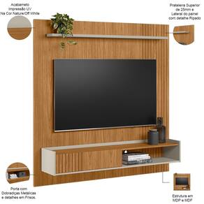 O Painel para TV 65 Pol com Bancada Suspensa 160cm Brooklin L05 Nature Off White é a solução perfeita para criar uma sala de estar moderna e funcional. Com design contemporâneo, esse painel home combina tonalidades e texturas que destacam a sua beleza como, por exemplo, os frisos estilo ripado e o puxador embutido, que proporcionam elegância. Já a funcionalidade, além de ser um painel para TV, de até 65 polegadas, ele ainda conta com uma prateleira superior e nicho espaçoso para organizar seus equipamentos eletrônicos, enquanto o compartimento interno da porta permite que você disponha itens extras de forma discreta e sempre ao alcane das mãos.