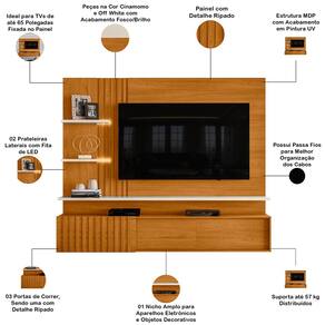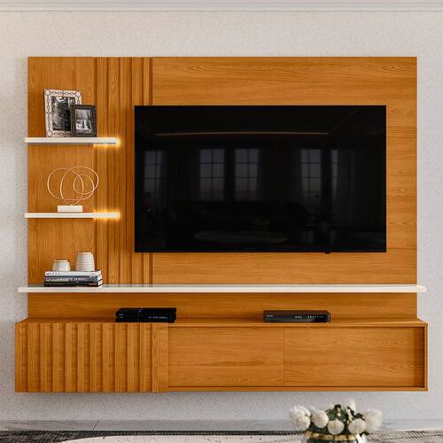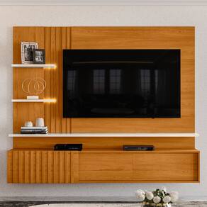 Projetado para TVs de até 65 polegadas, esse painel para TV é a solução perfeita para quem precisa de muita organização sem abrir mão do design. Na bancada suspensa, as 3 portas de correr com detalhes ripados escondem tudo o que você precisa, mantendo o visual clean, ao passo que as prateleiras laterais com fitas de LED são perfeitas para decorar e iluminar. Por fim, o detalhe ripado agrega personalidade e um toque contemporâneo.
