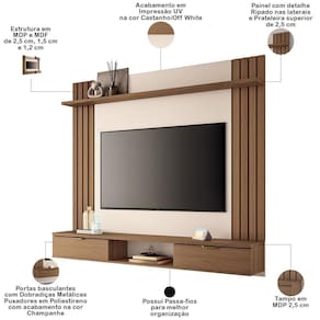 A estrutura inteligente do painel com bancada suspensa oferece espaço suficiente para acomodar sua TV de até 70 polegadas, além dos equipamentos eletrônicos de forma organizada. As portas basculantes são perfeitas para armazenar controles remotos, livros e acessórios, mantendo tudo ao seu alcance e livre de bagunça. Com isso, você terá um ambiente sempre arrumado e funcional. Enfim, esse painel para sala não apenas atende às suas necessidades de espaço e organização, mas também eleva o estilo da sua casa. Adicione um toque de sofisticação lar e transforme sua sala de estar em um verdadeiro refúgio de conforto e elegância com o Painel Soleil!