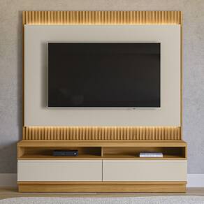 Características do Produto Material da estrutura: MDP/MDF. Acabamento: Pintura UV. Escala de Brilho: Fosco. Peso Suportado: 85 kg distribuídos. Suporta TV de até: 70 Polegadas. Possui Portas: Não. Quantidade de Gavetas: 2 Gavetas. Tipo de Corrediças: Telescópicas. Tipo de Puxadores: Alumínio Embutido. Possui Prateleiras: Não. Quantidade de Nichos: 2 Nichos. Possui Passa-Fios: Sim. Possui LED: Sim. Possui Pés: Sim. Tipo de Pés: Sapatas. Diferenciais: - Design moderno. - Pés estilo retrô em madeira maciça. - Tampo de 37mm para maior resistência - Painel com detalhe ripado e luminária LED. Sistema de Montagem: Parafusos/Cavilhas/Minifix. Manual de Montagem: Sim. Complexidade da Montagem: Média. Volumes: 3 Volumes. Conteúdo da Embalagem: 1 Painel, 1 Rack. Garantia do Fabricante: 90 dias contra defeito de fabricação. Montagem: Recomendamos que seja feita por um profissional. Recomendação de Limpeza: Utilize pano levemente úmido.
