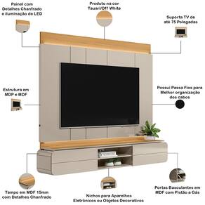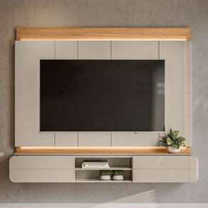 Com design amplo e robusto, esse painel suspenso é o cenário perfeito para sua TV de até 75 polegadas, criando um visual imponente e contemporâneo. Além disso, as linhas refinadas surpreendem com detalhes chanfrados que trazem um ar de exclusividade, enquanto a iluminação LED embutida transforma o ambiente em um convite ao aconchego. Já a bancada suspensa e os detalhes dos frisos nas portas basculantes revelam um cuidado meticuloso com cada curva, garantindo praticidade sem abrir mão do estilo. E o toque especial? Os cantos com linhas curvas que suaviza o conjunto, adicionando um charme único ao móvel.