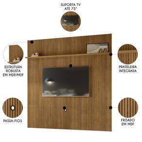 Características do Produto Material da estrutura: MDP/MDF. Espessuras das Chapas: 12mm/25mm. Acabamento: Pintura UV. Escala de Brilho: Brilho/Fosco. Peso Suportado: 38 kg. Suporta TV de até: 75 Polegadas. Possui Portas: Não. Possui Prateleiras: Sim. Quantidade de Prateleiras: 1 Prateleira. Possui Puxador: Não. Possui LED: Não. Possui Nicho: Não. Possui Passa-Fios: Sim. Diferenciais: - Painel frisado em MDF. - Estrutura resistente em MDP/MDF. - Prateleira integrada. - Suporta TVs de 75 polegadas. - Passa-fios. Sistema de Montagem: Parafusos/Cavilhas. Manual de Montagem: Sim. Complexidade da Montagem: Média. Volumes: 3 Volumes. Conteúdo da Embalagem: 1 Painel. Garantia do Fabricante: 90 dias contra defeito de fabricação. Montagem: Recomendamos que seja feita por um profissional. Recomendação de Limpeza: Utilize pano levemente úmido.