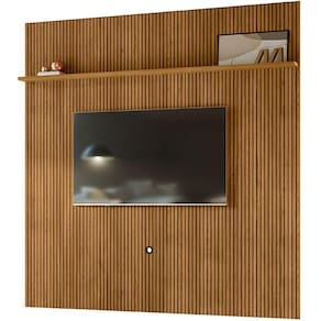 Característica do Painel Suspenso e Rack Bancada para Sala TV até 75 polegadas: - Estrutura em MDP e MDF de 12, 15 e 25 mm de espessura; - Acabamento de pintura em UV; - Para tv de até 75 polegadas; - Painel em MDF frisado (baixo relevo); - 1 prateleira superior; - Espaço para TV no Painel: (L x A): 2,380 x 1,200 m; - Espaço para Tv no Rack (L x A) : 1830 x 380 mm; - 2 Portas íveis em MDF; - Tampo e base com detalhes curvos; - Prateleira central; - Puxadores em poliestireno; - Pés palito; - Não acompanha objetos de decoração e aparelhos eletrônicos;