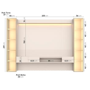 A iluminação embutida valoriza o painel e cria uma atmosfera acolhedora, destacando a TV e os objetos decorativos. O conjunto conta com 2 cristaleiras laterais com portas em vidro reflecta, que proporcionam um efeito elegante e contemporâneo. As molduras em alumínio garantem resistência e acabamento refinado, enquanto as dobradiças com amortecedor asseguram um fechamento suave, silencioso e confortável.