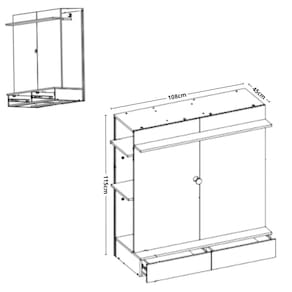 Características: 1 Cabideiro em alumínio 2 Gavetas 2 Prateleiras Corrediças telescópicas Estrutura em MDP 12 e 15mm Fundo em HDF 3mm Gavetas suportam peso máximo 5kg Prateleiras menores suportam peso máximo 4kg Prateleira maior suporta peso máximo 3kg