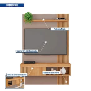 PAINEL PARA TV ATÉ 45 COM PORTA DESLIZANTE JADE CAEMMUN Deixe sua sala sofisticada e elegante com Painel Jade da Caemmun. Com detalhes modernos na lateral ripada em baixo relevo, o painel suporta uma TV de até 45 polegadas. Confira mais detalhes