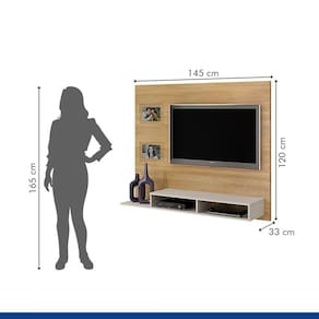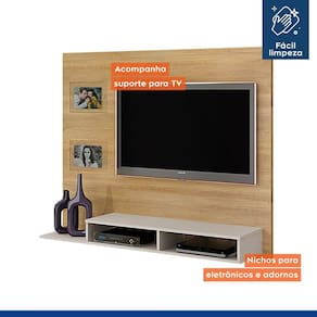 O Painel Hades da Valdemóveis foi criado pensando em ocupar o mínimo de espaço, e por isso tem apenas 145 cm de largura. Possui nicho para aparelhos eletroeletrônicos, compacto para pequenos ambientes. Comporta TV de até 46 Polegadas e o suporte para TV já vem incluso. Garantia de até 90 dias por defeito de fabricação. Montagem não inclusa. Acabamento: Pintura UV Acabamento da Prateleira: Pintura Ambiente Principal: Sala de Estar Complexidade da Montagem: Média: pode ser montado por mais de uma pessoa e/ou necessite de maior conhecimento para montagem Cor: Cinamomo/Off White Cor do Produto: Cinamomo/Off White Escala de Brilho: Fosco Escala de Brilho da Prateleira: Fosco Ideal para TVs até (Polegadas): 46 Itens Inclusos: 1 Painel, Kit Ferragens e Manual de Montagem. Manual de Montagem e Instalação: https://cdn2.madeiramadeira.com.br/atributo/valdemoveis/813086-manual-de-montagem-painel-hades.pdf Material da Prateleira: MDP Material Principal: MDF/MDP Necessita Montagem: Sim Origem do Produto: Nacional Peso: 28,7 kg Peso Máximo por Prateleira: 10 kg Possui Espelho: Não Possui iluminação: Não Possui Pés: Não Possui Portas: Não Possui Prateleiras: 02 Possui Tomada: Não Quantidade de Nichos: 02 Recomendações de Uso, Manutenção e Limpeza: Recomendamos que a limpeza seja feita apenas com pano umedecido. Sistema de Montagem: Cavilhas e Parafusos Suporte de TV Universal Incluso: Sim
