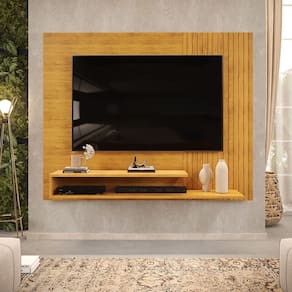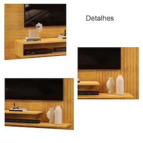 Características: Estrutura em MDF e MDP Acabamento UV Detalhes em Ripado 02 Prateleiras de 15mm 01 Nicho Suporta: Painel 40 kg e Base 10 kg Ideal para TV até 50 Polegadas