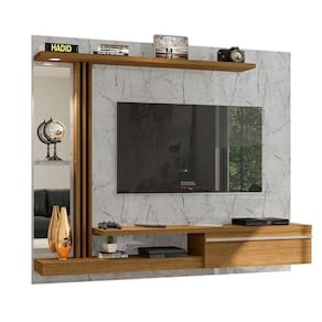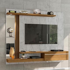 Características: Estrutura em MDP de 15 e 12mm Prateleira superior de 25mm 1 Porta basculante Dobradiças Metálicas Puxador de MDF Revestido 1 Nicho LED com botão Liga/Desliga Espelhos Decorativos Espaço para TVs de 55 polegadas Prateleira de vidro com suportes metálicos Ripas decorativas