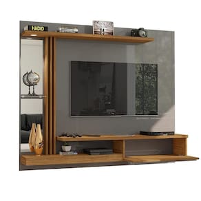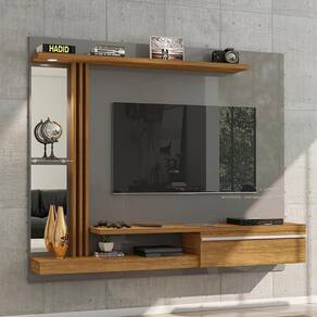 Características: Estrutura em MDP de 15 e 12mm Prateleira superior de 25mm 1 Porta basculante Dobradiças Metálicas Puxador de MDF Revestido 1 Nicho LED com botão Liga/Desliga Espelhos Decorativos Espaço para TVs de 55 polegadas Prateleira de vidro com suportes metálicos Ripas decorativas