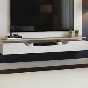 Produzido em MDF e MDP de alta durabilidade, o painel conta com duas portas basculantes curvas, uma prateleira superior de 25mm e uma prateleira inferior chanfrada de 25mm, criando um visual refinado e proporcionando espaço ideal para decorar e organizar aparelhos eletrônicos.