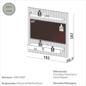 Características: Estrutura 100% MDF Acabamento em Pintura UV Brilho/Fosca Painel Ripado Necessita de Fixação na Parede 02 Gavetas com Corrediças Telescópicas Prateleira Superior Acompanha LED Ideal para TV até 65 Polegadas