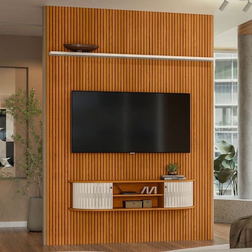 - Observação: Produto desenvolvido para ser fixado na parede. O televisor deve ser fixado no painel. Painel em MDF frisado (baixo relevo), portas flexíveis em MDF, tampo e base com detalhes curvos, puxadores em poliestireno, estrutura com chapas em MDP e MDF de 12, 15 e 25mm.