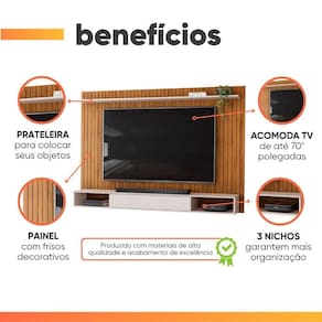 DIFERENCIAL: Porta deslizante / 03 nichos para melhor armazenamento / Painel espaçoso com frisado autêntico / Prateleira superior extensa / Suporta TV de até 70 polegadas.